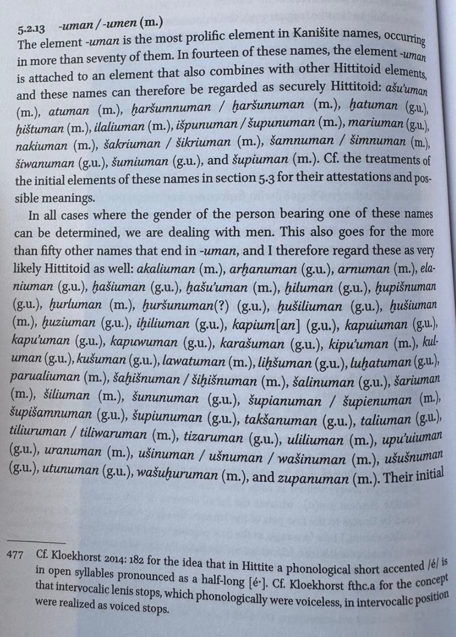 It's the mythological and actual genetic route of Hittite. The Hittite empire was one of the great empires of antiquity. When scholars are given a set of documents, as they have in this village, Kanis, around 20, 23,000, I think it is, cuneiform texts, and they're trying to distinguish what which is the Indo-European root of Hittite, Kanisite Hittite in this document, and which is the Assyrian, then the -Uman sound is used to distinguish the Indo-European from the Assyrian.