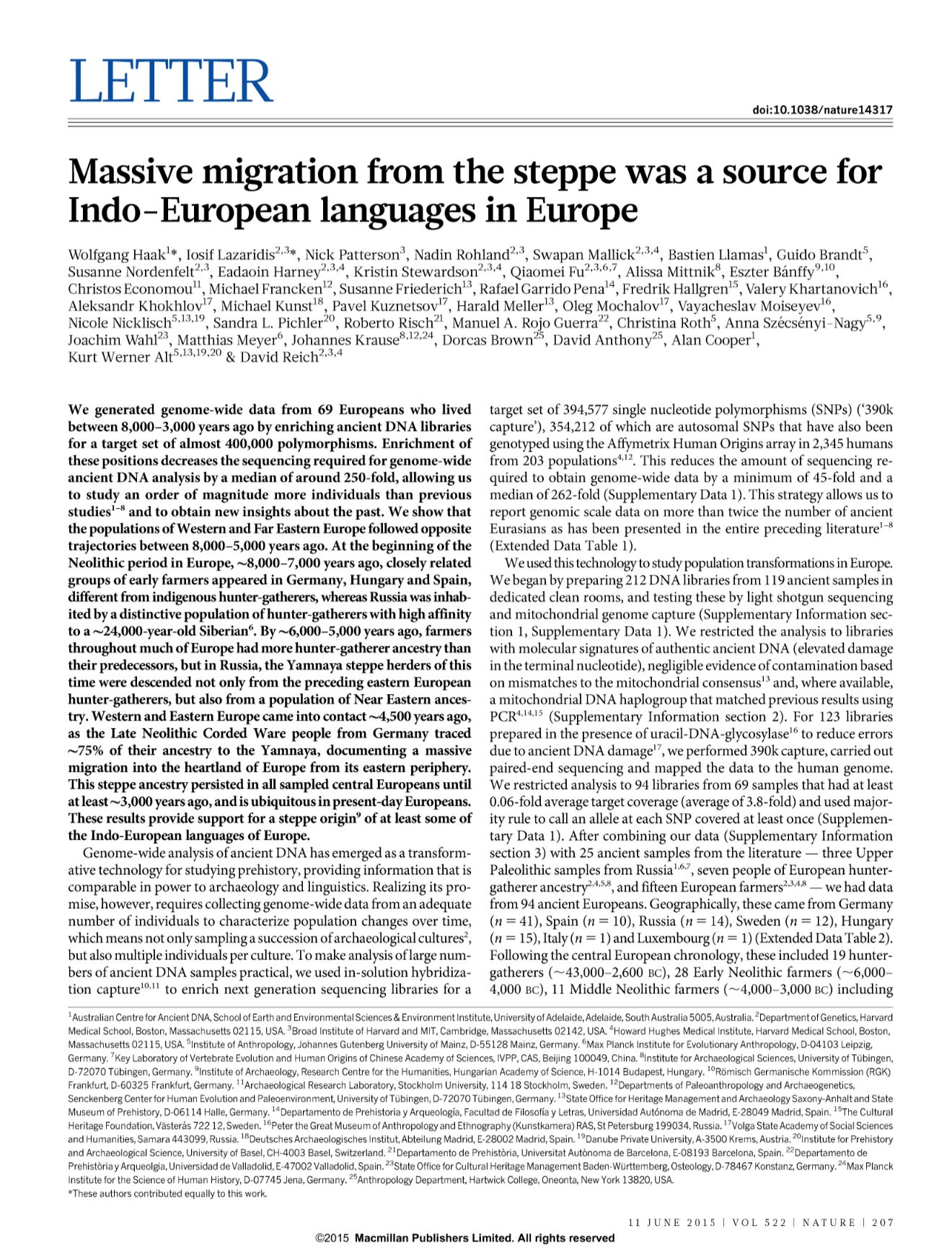 Particularly since 2015, when the first definitive paper using ancient genetics, the examination of ancient DNA, was published in humanity's preeminent scientific journal, Nature.