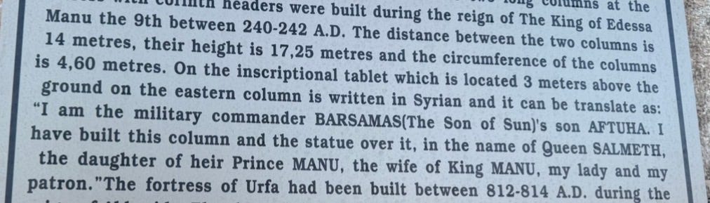 I’m Decoding Trolls, speaking to you from a place in southern Turkey called Göbekli Tepe, near the city of Urfa, historically known as Edessa. Yesterday, I saw an inscription dedicating Roman-era columns to the king of Edessa, son of Manu. This inscription dates back to around the third century of the Common Era, confirming that I am in the right place at the right time.