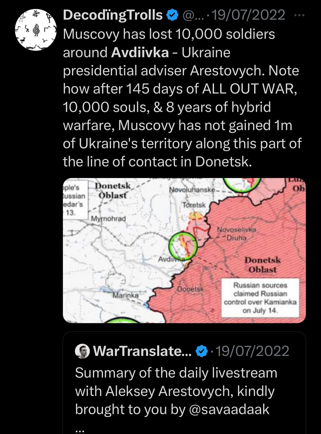 By July 2022 Ruschia had lost 10,000 souls (RIP) trying to take Avdiivka. Now, 20,000 souls later, they still can’t capture it. Avdiivka is not Berlin. It’s not Kyiv. It’s a small town.
